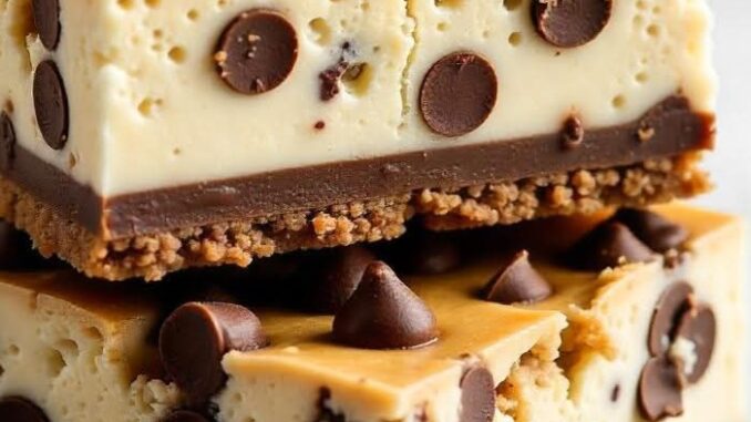Estas deliciosas barras combinan una corteza de galleta con chispas de chocolate con un centro de tarta de queso cremoso, terminada con una capa de masa de galletas con chispas de chocolate en la parte superior.¡Perfecto para cualquier deseo dulce!