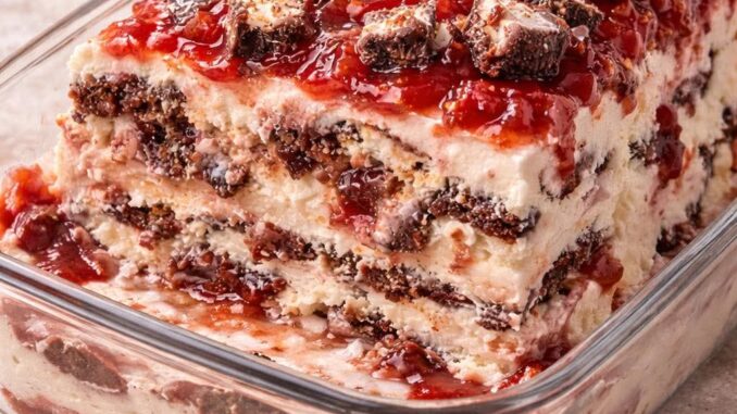 Agregamos un poco de mezcla y arriba trozos de gansito y después arriba del gansito agregamos mermelada.