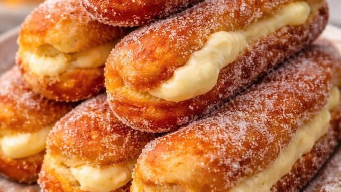 Bollitos de Crema. Son básicamente una masa de brioche frita (similar a una dona), rebozada en azúcar y rellena de una suave crema pastelera.
