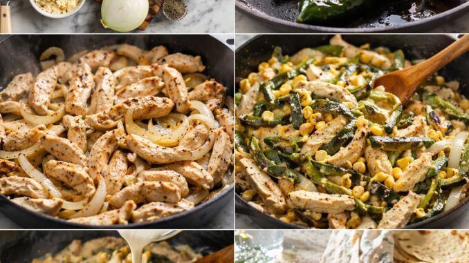 10. Sirve el pollo con rajas bien caliente acompañado de tortillas, arroz blanco o frijoles, y si quieres darle un toque extra puedes terminar con un poco más de maíz o unas tiras finas de poblano por encima.