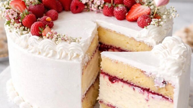 🌸 Delicia Celestial de Mamá: Pastel de Vainilla con Cheesecake y Corazón de Frutos Rojos 🌸