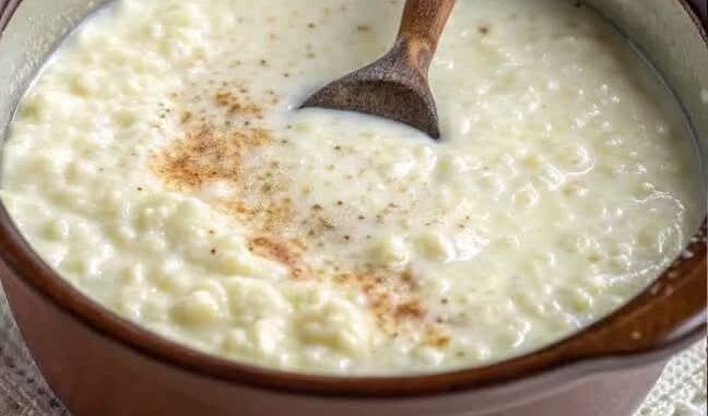Este es un clásico Arroz con Leche, un postre tradicional que destaca por su cremosidad y ese aroma inconfundible a canela. La clave de la foto es que el arroz se ve muy hidratado y el caldo tiene una textura sedosa.